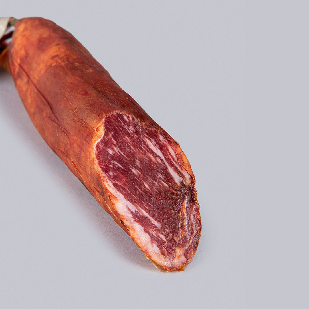 Lombo di maiale iberico alimentato a ghianda, paprica, sale comune, spezie naturali, conservanti (E252 nitrato di potassio e E250 nitrato di sodio), antiossidanti (E301 ascorbato di sodio), involucro di tipo fibrato.