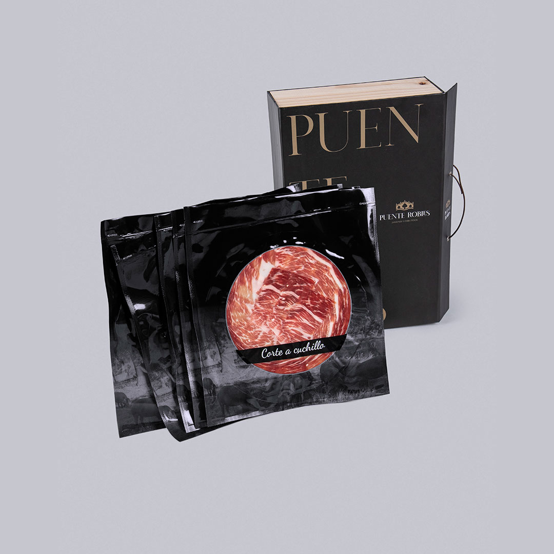 Per un periodo di tempo limitato PRENDI 6 E PAGHI 5. Confezioni da 100 gr. circa di Prosciutto di Cebo Iberico 50% Razza Iberica tagliato a coltello (professionale).