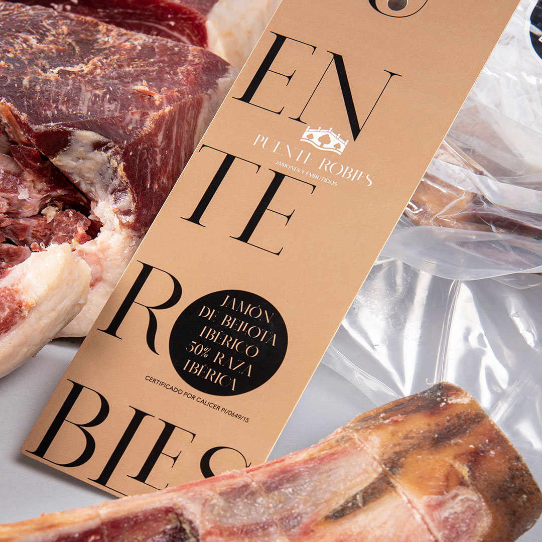 Questo prosciutto iberico di razza pura al 50% è il risultato dell'attento allevamento di maiali iberici alimentati principalmente con cereali e ghiande, che gli conferiscono un sapore ineguagliabile e una consistenza delicata.