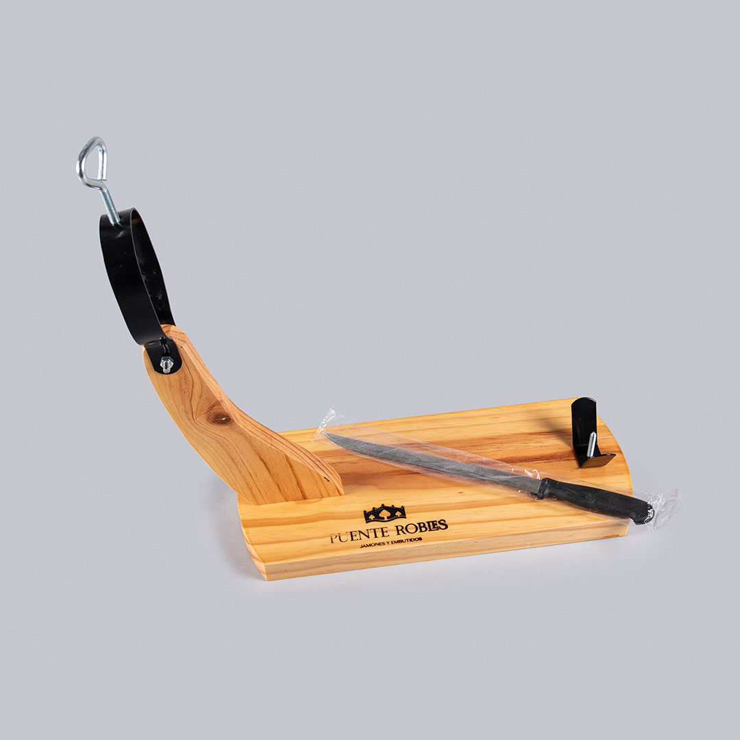 Eleganza e funzionalità nel tagliere per prosciutto modello Gondola personalizzato da Puente Robles. Include anche un coltello di alta qualità.