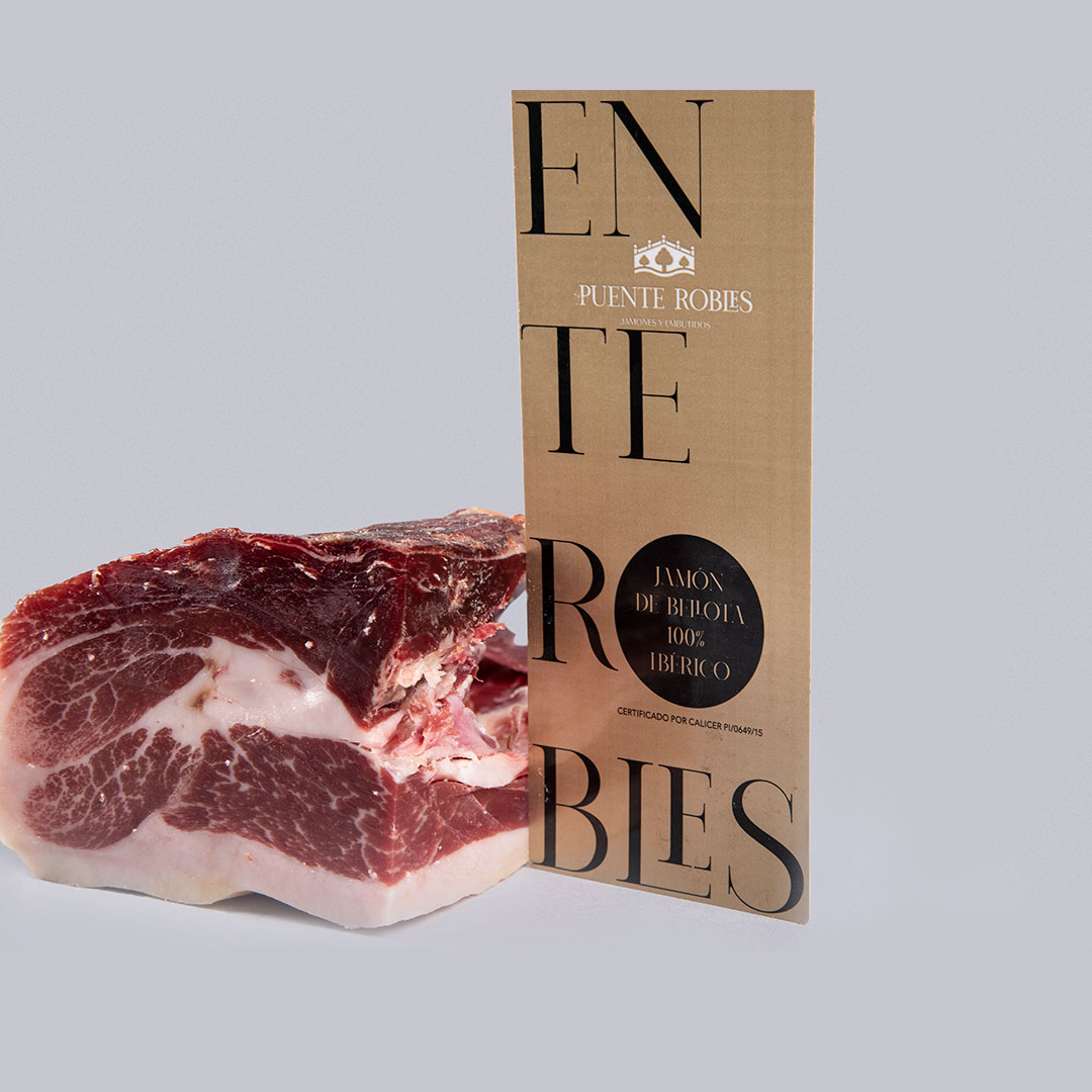 Questo prosciutto iberico 100% di razza pura è il risultato dell'attento allevamento di maiali iberici alimentati principalmente con cereali e ghiande, che gli conferiscono un sapore unico e una consistenza delicata.